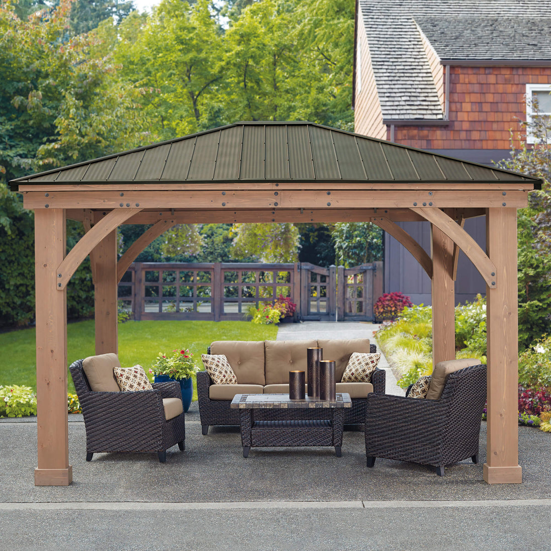 Expand your outdoor living space with this 12 x 14 wood gazebo by Yardistry. The Wood Gazebo with Aluminum Roof adds character to any area, creating the perfect setting for outdoor entertainment. The stunning design features a Montana bronze aluminum roof, 6” x 9” posts finished with classic plinths and sleek curved gussets.  The 100% FSC® Certified Cedar Lumber is finished with a beautiful mocha brown stain that brings warmth and a distinctive feel to any space. The illustrated step-by-step instructions and helpful hints video will guide you through every installation step. The 12 x 14 wood gazebo is a multi-functional product that is perfect for any outdoor space. Use this gazebo to add a multi-functional room to your property. Transform it into a place to gather with hanging fixtures, plants, comfortable seating, and a table to use for drinks, snacks, or entertainment.